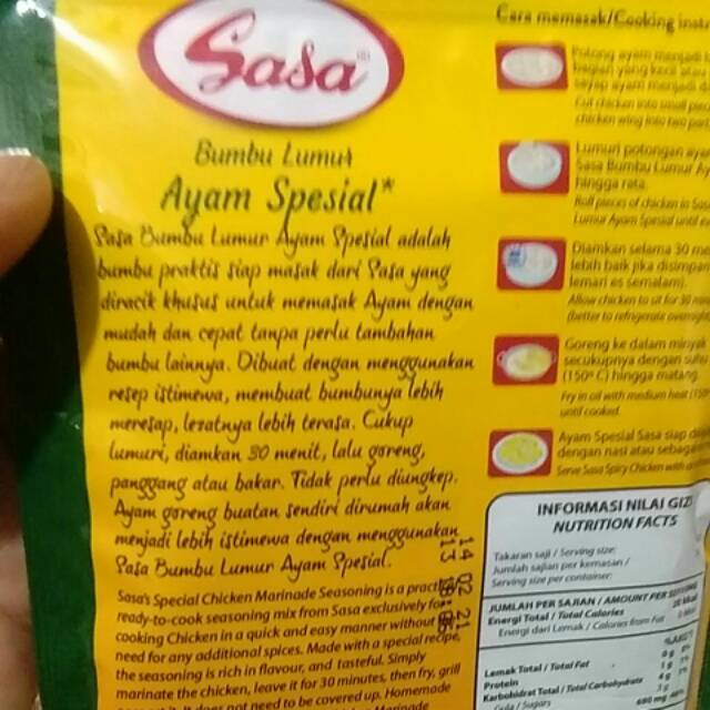 Cara Masak Ayam Bumbu Lumur Sasa Language:id : Sasa tepung bumbu ayam spesial merupakan tepung bumbu masak instan pilihan untuk menciptakan masakan ayam tepung yang lezat.. About press copyright contact us creators advertise developers terms privacy policy & safety how youtube works test new features press copyright contact us creators. Peran seorang istri bukan cuma menangani rumah saja, namun kamu juga wajib menyediakan kebutuhan gizi tercukupi dan juga olahan yang disantap keluarga tercinta wajib … Campur ayam dengan sasa bumbu lumur ayam spesial, kemudian gulingkan potongan ayam ke sasa tepung bumbu original. Cuci bersih potongan ayam, tiriskan. Jul 23, 2021 · cara membuat ayam goreng spesial: